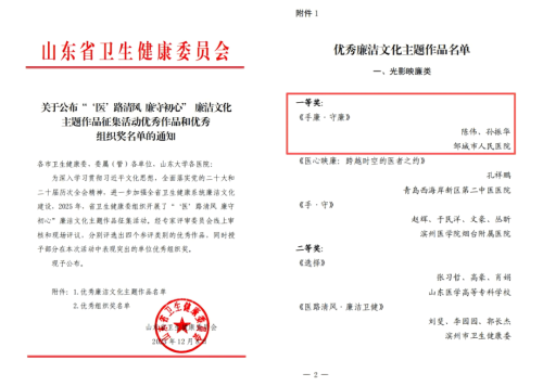 近日,山东省卫生健康委公布了“‘医’路清风 廉守初心” 廉洁文化主题作品征集活动优秀作品和优秀组织奖名单。其中,由邹城市人民医院报送的微电影《手廉·守廉》经专家评审委员会线上审核和现场评议,从众多作品中脱颖而出,斩获光影映廉类一等奖。