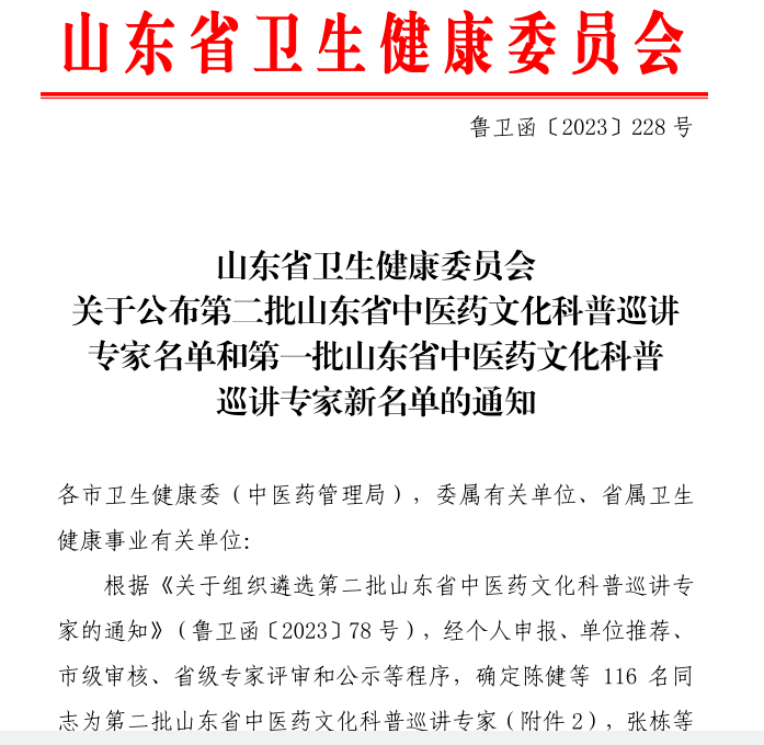 2023年,根据《关于组织遴选第二批山东省中医药文化科普巡讲专家的通知》(鲁卫函[2023] 78号),经个人申报、单位推荐、市级审核、省级专家评审和公示等程序,确定116人为第二批山东省中医药文化科普巡讲专家,王建明、卢加庆成功入选。
